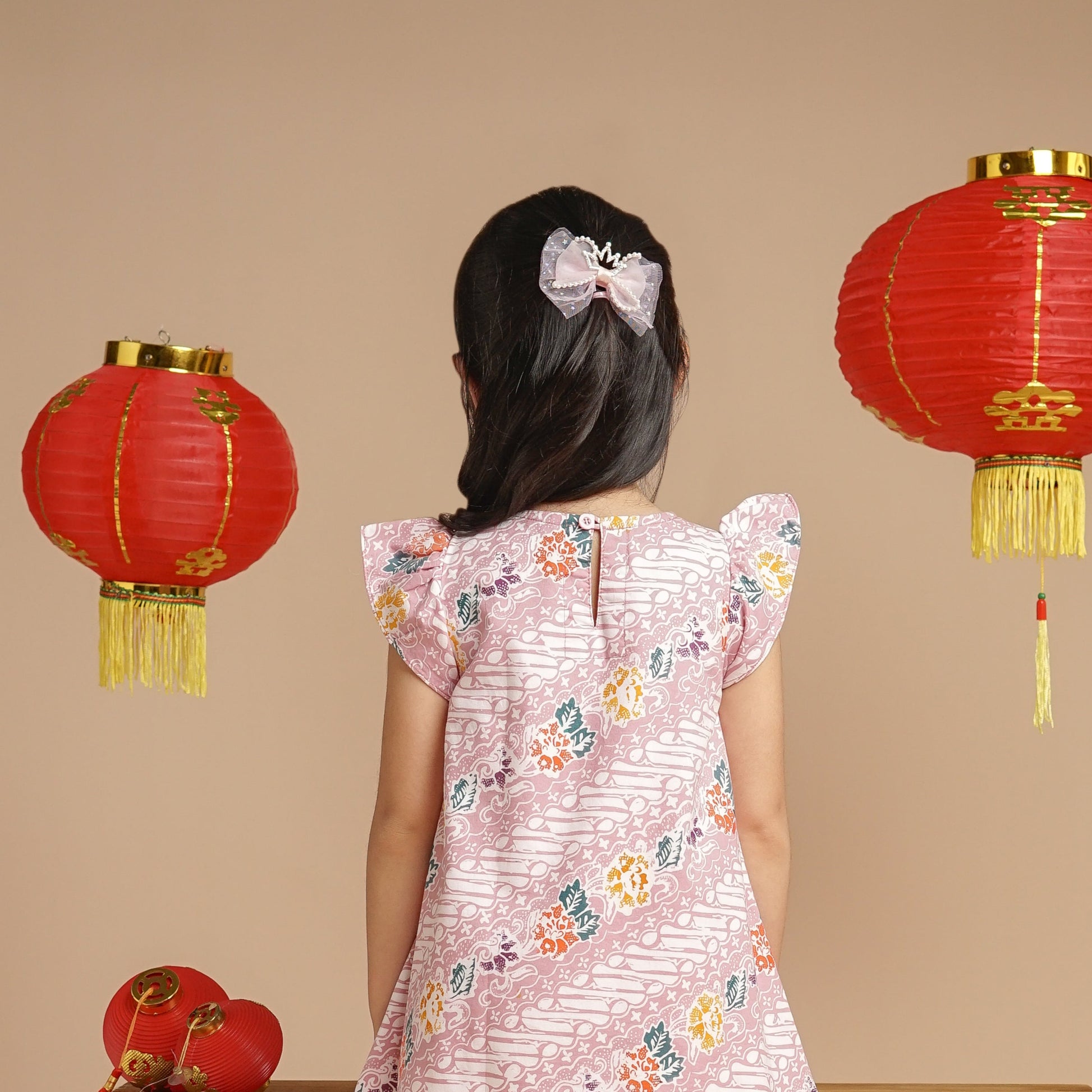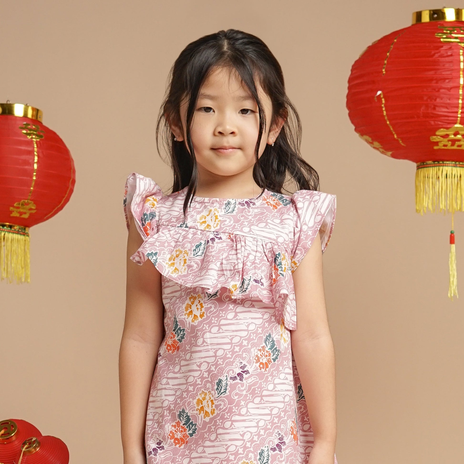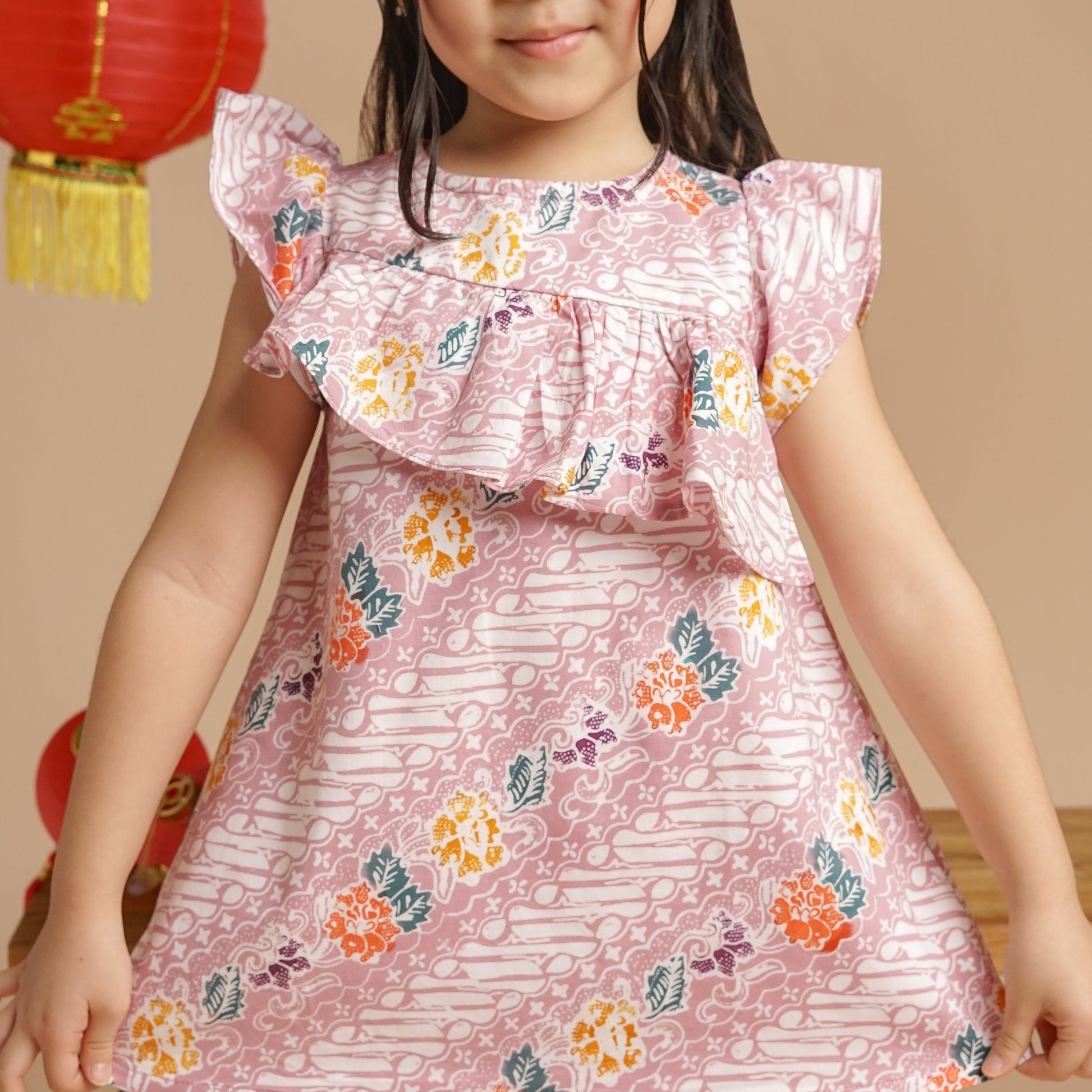 This batik dress features ruffles on the chest and ruffled sleeves, creating a perfect silhouette for your little one with its A-line skirt. Perfect for your little Candy.